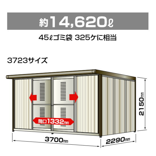 商 品 詳 細商品名【ゴミストッカー MD型 GSMD-3723SK】 大型 収集ゴミ箱 袋 置場 カラス対策 猫 ストッカー ボックス 収集庫 集積庫 収納庫 屋外 町内会 自治体サイズ(mm)間口3700×奥行き2290×高さ2150 詳しくは詳細図でご確認下さい。