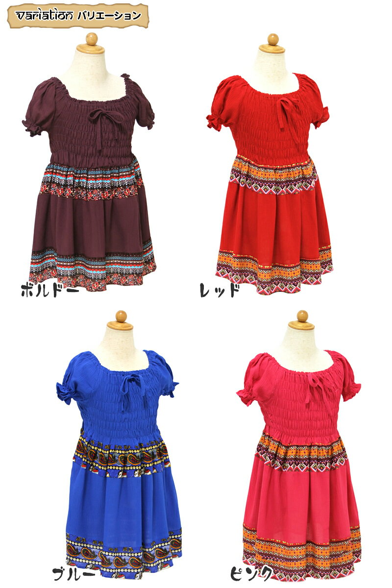 アイテムインフォ ペイズリーやぞうさんの柄生地がエスニック感あふれる子供用キャミソールドレスです。