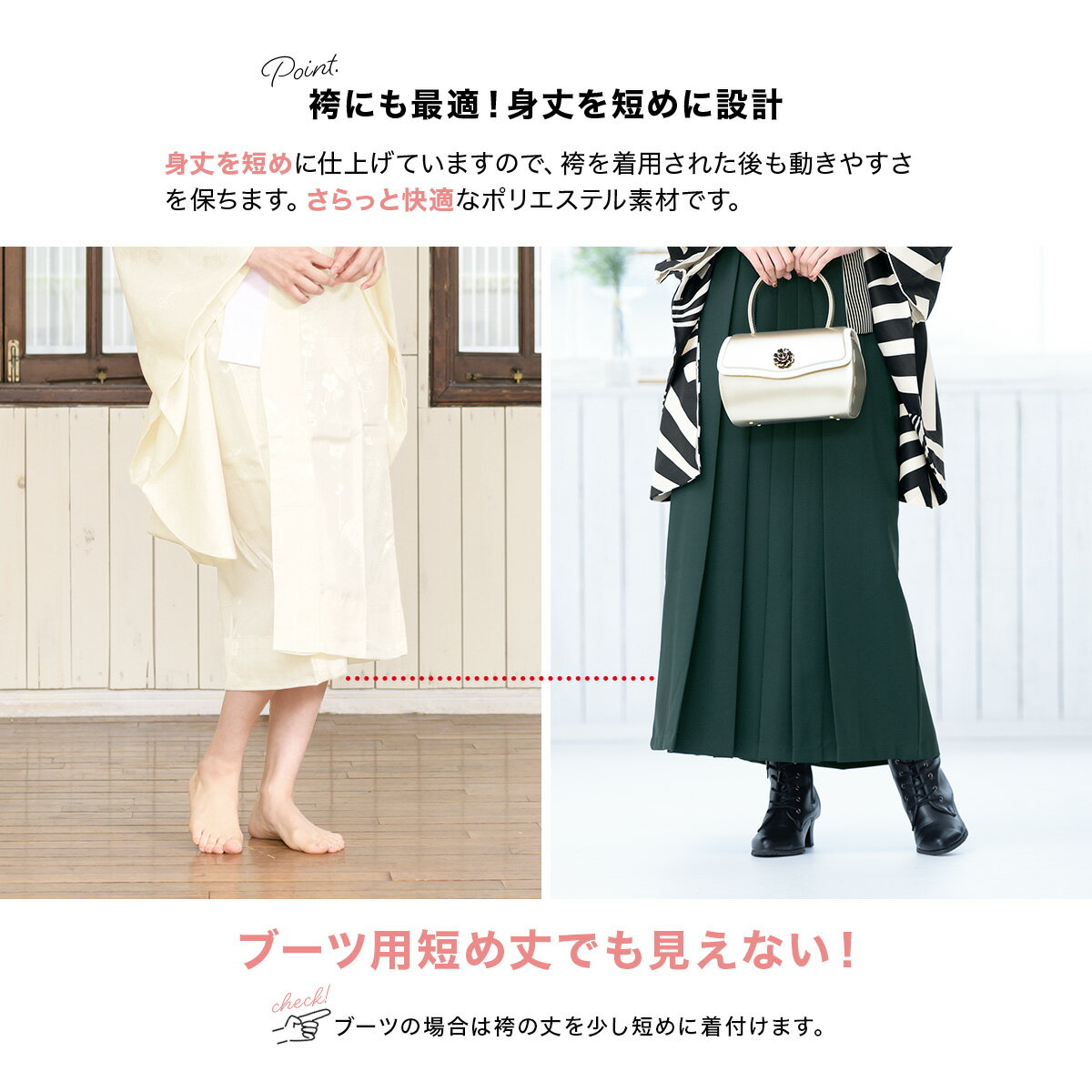 着丈が短い半着の襦袢ですので、着付けもしやすく、袴を着用された後も動きやすさを保ちます。