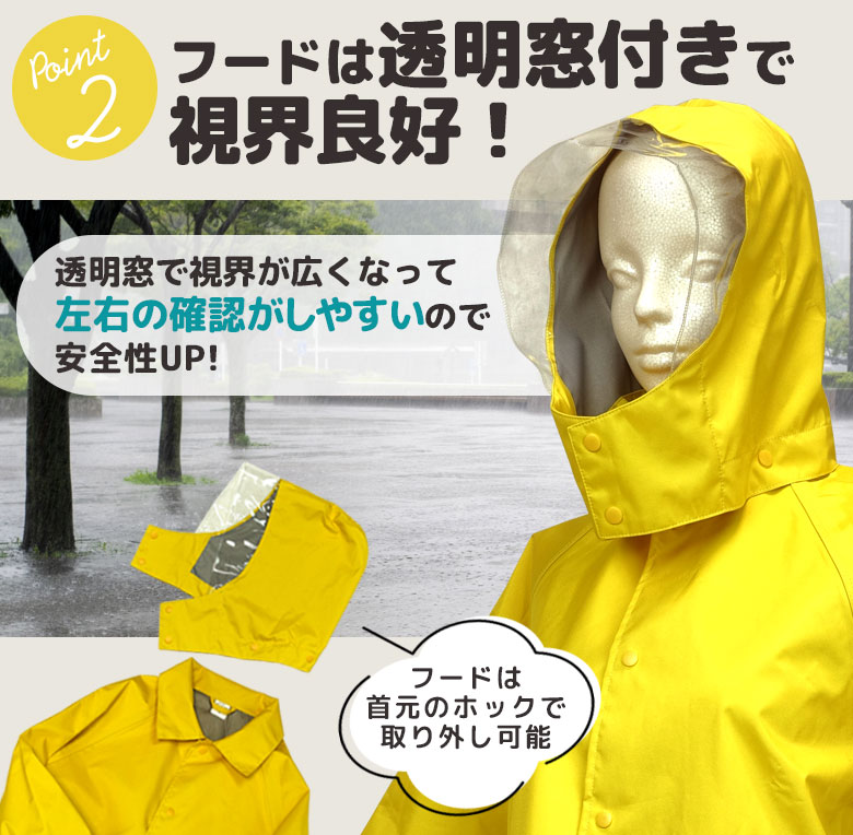 ホックで取り外し可能な透明窓付きフードで雨の日でフードを被っていても視界が開けて安全です。