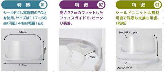 マウスシールドスダンダード(10枚入り) 【材質】 シールドユニット:PC、PP フェイスガイド:PP、ナイロン、シリコン 傷防止フィルム:PE 袋:OPP 箱:紙 【サイズ】 117×58mm(円弧144mm)軽量12g ●鼻、口元を樹脂シールドで覆い、息や飛沫の飛散をブロック。