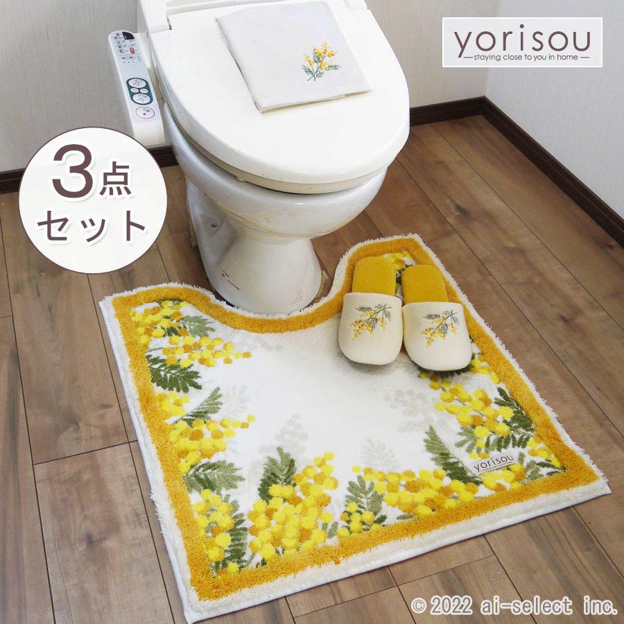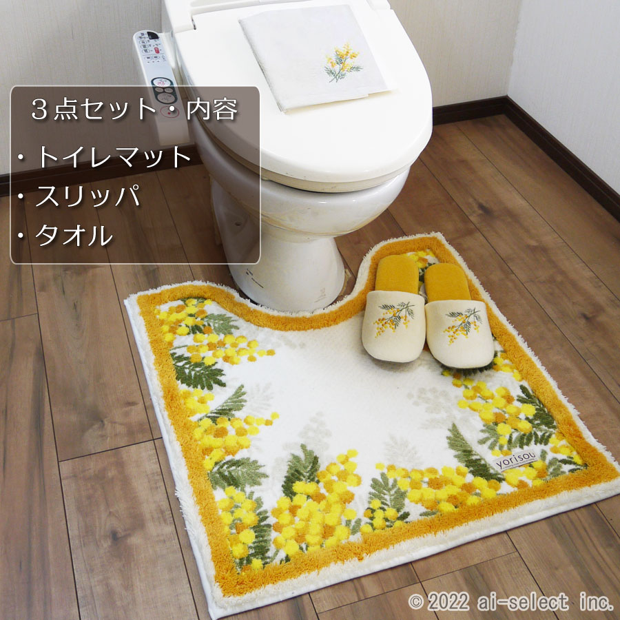 トイレマット 3点セット フタカバー無し ペーパーホルダーカバー無し ミモザ 黄色い小花 元気が出るカラー イエロー 淡い黄色 おしゃれ 立体感あるデザイン