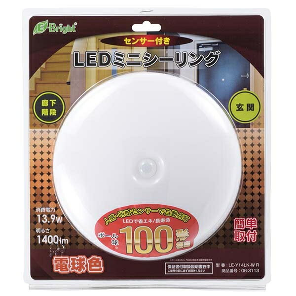 ギフトサービスについて 楽天国際配送対象店舗 (海外配送) Rakuten International Shipping・商品名: 人感・明暗センサー付 LEDミニシーリングライト(100W相当/1400lm/電球色)・型番: LE-Y14LK-W R・JANコード: 4971275631137・販売元: (株)オーム電機【特徴】人感・明暗センサーで自動点灯!廊下・階段・玄関にコンパクトサイズのLEDミニシーリングライトです●人を感知して自動で点灯します●人がいなくなると一定時間後に消灯します●全面発光で明るい!●直径165mmのミニサイズ●ボール球100形相当の明るさ【仕様】■ 光源色:電球色■ 定格電圧:AC100V 50/60Hz■ 定格消費電力:13.9W■ 定格入力電流:255mA■ 全光束:1400lm■ 平均演色評価数:Ra80■ 点灯時間:約180秒■ 定格寿命:40000時間■ 使用場所:屋内用(屋外使用禁止)■ 本体寸法(約):直径165 x 長さ65mm■ 本体質量(約):250g商品特徴一覧【LED照明器具 → ミニシーリングライト】、LE-Y14LK-W R、(株)オーム電機、06-3113、4971275631137、通信販売、通販、販売、買う、購入、お店、売っている、ショッピング【人感・明暗センサー付 LEDミニシーリングライト(100W相当/1400lm/電球色) (LE-Y14LK-W R)】広告文責(有)イースクエアTEL:0120-532-772・商品名: 人感・明暗センサー付 LEDミニシーリングライト(100W相当/1400lm/電球色)・型番: LE-Y14LK-W R・JANコード: 4971275631137・販売元: (株)オーム電機【特徴】人感・明暗センサーで自動点灯!廊下・階段・玄関にコンパクトサイズのLEDミニシーリングライトです●人を感知して自動で点灯します●人がいなくなると一定時間後に消灯します●全面発光で明るい!●直径165mmのミニサイズ●ボール球100形相当の明るさ【仕様】■ 光源色:電球色■ 定格電圧:AC100V 50/60Hz■ 定格消費電力:13.9W■ 定格入力電流:255mA■ 全光束:1400lm■ 平均演色評価数:Ra80■ 点灯時間:約180秒■ 定格寿命:40000時間■ 使用場所:屋内用(屋外使用禁止)■ 本体寸法(約):直径165 x 長さ65mm■ 本体質量(約):250g※お客さま都合による、ご注文後の[キャンセル][変更][返品][交換]はお受けできませんのでご注意下さいませ。