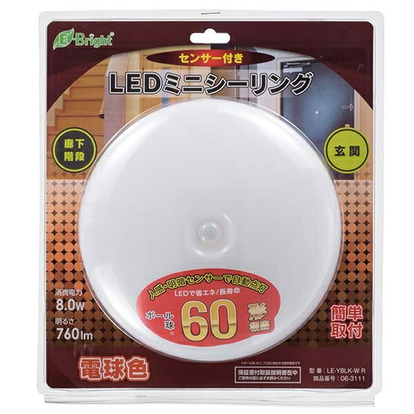 ギフトサービスについて 楽天国際配送対象店舗 (海外配送) Rakuten International Shipping・商品名: 人感・明暗センサー付 LEDミニシーリングライト(60W相当/760lm/電球色)・型番: LE-Y8LK-W R・JANコード: 4971275631113・販売元: (株)オーム電機【特徴】人感・明暗センサーで自動点灯!廊下・階段・玄関にコンパクトサイズのLEDミニシーリングライトです●人を感知して自動で点灯します●人がいなくなると一定時間後に消灯します●全面発光で明るい!●直径165mmのミニサイズ●ボール球60形相当の明るさ【仕様】■ 光源色:電球色■ 定格電圧:AC100V 50/60Hz■ 定格消費電力:8W■ 定格入力電流:160mA■ 全光束:760lm■ 平均演色評価数:Ra80■ 点灯時間:約180秒■ 定格寿命:40000時間■ 使用場所:屋内用(屋外使用禁止)■ 本体寸法(約):直径165 x 長さ65mm■ 本体質量(約):250g商品特徴一覧【LED照明器具 → ミニシーリングライト】、LE-Y8LK-W R、(株)オーム電機、06-3111、4971275631113、通信販売、通販、販売、買う、購入、お店、売っている、ショッピング【人感・明暗センサー付 LEDミニシーリングライト(60W相当/760lm/電球色) (LE-Y8LK-W R)】広告文責(有)イースクエアTEL:0120-532-772・商品名: 人感・明暗センサー付 LEDミニシーリングライト(60W相当/760lm/電球色)・型番: LE-Y8LK-W R・JANコード: 4971275631113・販売元: (株)オーム電機【特徴】人感・明暗センサーで自動点灯!廊下・階段・玄関にコンパクトサイズのLEDミニシーリングライトです●人を感知して自動で点灯します●人がいなくなると一定時間後に消灯します●全面発光で明るい!●直径165mmのミニサイズ●ボール球60形相当の明るさ【仕様】■ 光源色:電球色■ 定格電圧:AC100V 50/60Hz■ 定格消費電力:8W■ 定格入力電流:160mA■ 全光束:760lm■ 平均演色評価数:Ra80■ 点灯時間:約180秒■ 定格寿命:40000時間■ 使用場所:屋内用(屋外使用禁止)■ 本体寸法(約):直径165 x 長さ65mm■ 本体質量(約):250g※お客さま都合による、ご注文後の[キャンセル][変更][返品][交換]はお受けできませんのでご注意下さいませ。