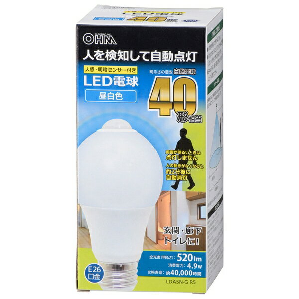 ・商品名: LED電球(40形相当/520 lm/昼白色/E26/人感・明暗センサー付)・型番: LDA5N-G R5・JANコード: 4971275635463・販売元: (株)オーム電機【特徴】●人の動きを検知して自動で点灯します●人の動きがなくなると約120秒(2分)後に自動消灯、人が動くと点灯は延長されます●日中など明るい場所(周囲の明るさが100〜150lx以上)では点灯しません●明るさの目安、白熱電球40W形相当●玄関・廊下・トイレに●昼白色●口金:E26【仕様】■寸法:全長…116mm、最大径…60mm■質量:85g■定格消費電力:4.9W■待機消費電力:0.2W■全光束:520 lm■平均演色評価:Ra80■定格寿命:40000h※屋内用(屋外使用禁止)※交流電源 100V 50/60Hz 共用[ご注意]※次のような器具には使用できません・密閉器具・調光機能のついた器具(100%点灯でも使用不可)・水銀灯器具など・断熱材施工器具(SB,SGI,SG形表示器具など)・ランプと反射板の距離が狭い器具・直流電源※このほか使用器具の種類によって寸法的、熱的、その他の状況(リモコン機器のついた器具など)により使用できない場合があります※ご使用になられる照明器具の構造によっては、放熱不良で短寿命となることがあります商品特徴一覧【LED電球 → 一般電球形 → 人感センサー付き】、LDA5N-G R5、(株)オーム電機、06-3546、4971275635463、通信販売、通販、販売、買う、購入、お店、売っている、ショッピング【LED電球(40形相当/520 lm/昼白色/E26/人感・明暗センサー付) (LDA5N-G R5)】広告文責(有)イースクエアTEL:0120-532-772・商品名: LED電球(40形相当/520 lm/昼白色/E26/人感・明暗センサー付)・型番: LDA5N-G R5・JANコード: 4971275635463・販売元: (株)オーム電機【特徴】●人の動きを検知して自動で点灯します●人の動きがなくなると約120秒(2分)後に自動消灯、人が動くと点灯は延長されます●日中など明るい場所(周囲の明るさが100〜150lx以上)では点灯しません●明るさの目安、白熱電球40W形相当●玄関・廊下・トイレに●昼白色●口金:E26【仕様】■寸法:全長…116mm、最大径…60mm■質量:85g■定格消費電力:4.9W■待機消費電力:0.2W■全光束:520 lm■平均演色評価:Ra80■定格寿命:40000h※屋内用(屋外使用禁止)※交流電源 100V 50/60Hz 共用[ご注意]※次のような器具には使用できません・密閉器具・調光機能のついた器具(100%点灯でも使用不可)・水銀灯器具など・断熱材施工器具(SB,SGI,SG形表示器具など)・ランプと反射板の距離が狭い器具・直流電源※このほか使用器具の種類によって寸法的、熱的、その他の状況(リモコン機器のついた器具など)により使用できない場合があります※ご使用になられる照明器具の構造によっては、放熱不良で短寿命となることがあります※お客さま都合による、ご注文後の[キャンセル][変更][返品][交換]はお受けできませんのでご注意下さいませ。
